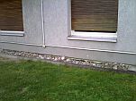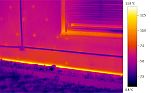 Fehlende Perimeter-Wärmedämmung im Sockelbereich der Wärmedämmfassade. Die "hellen Punkte" auf dem Wärmebild sind die Dämmstoffdübel.